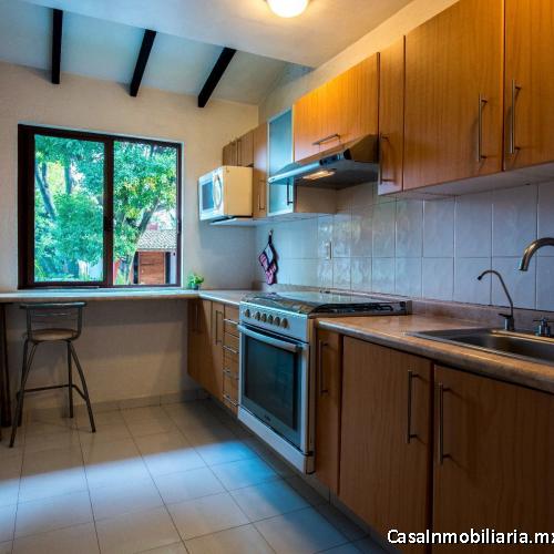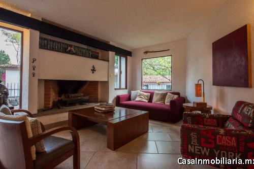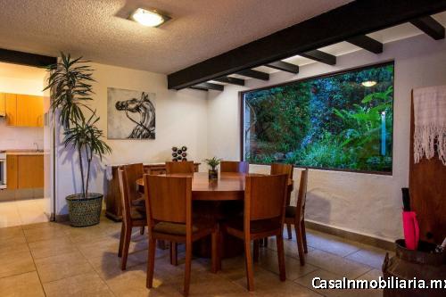 Muy iluminada por sus ventanas tipo Barragán y rodeada de jardines, esta propiedad cuenta con sala con chimenea, comedor con jardín interior y vista arbolada, cocina integral con acceso independiente, área de lavado y dos lugares de estacionamiento de buen tamaño en planta baja.