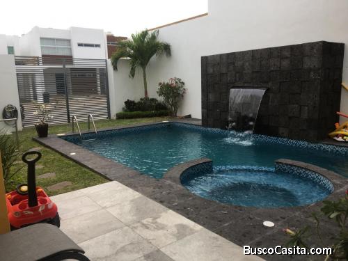 ventanal piso a techo con vista a la alberca, sala, comedor, cuarto de T.V, cocina integral con isla de granito, area de lavado,