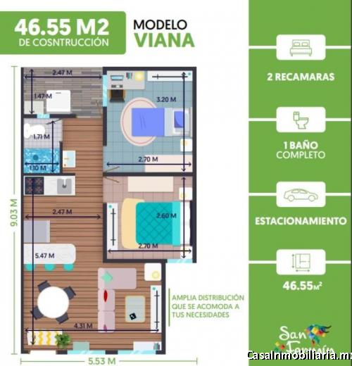 SAN FERMIN, COTO CERRADO, 46.55 M2, 1 CAJON DE ESTACIONAMIENTO. 2 RECAMARAS, SALA, BAÑO, COMEDOR.