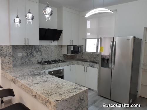 Recibidor, Sala, comedor, cocina estilo americano equipada con anaqueles altos y bajos, mesón de granito, baño social, lavandería externa.