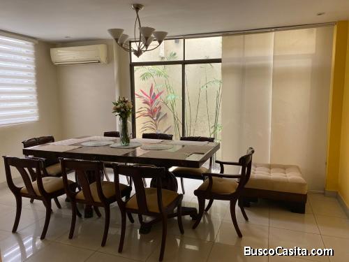 Diagonal al C.C. EL DORADO, Iglesia, Centro Educativos, Universidades, Bancos. Semi amoblada 4 aires split, 4 lamparas ventiladores, repisas aéreas decorativas, juego de cama 2plazas completo, cocina encimera a gas, anaqueles de cocina renovados, horno empotrado a gas, calentador de agua eléctrico, bomba-cisterna, cerradura de puerta principal digital. Área de patio decorativa mas cuarto de oficina, climatizado, con cuarto de baño integrado.