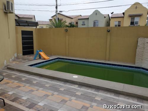 Sala amplia, comedor y cocina con anaqueles altos y bajos, patio amplio con área de BBQ techada y piscina.