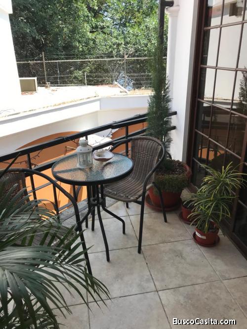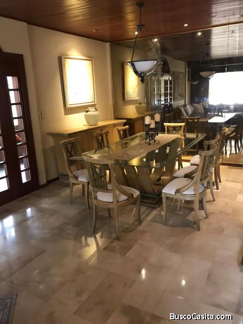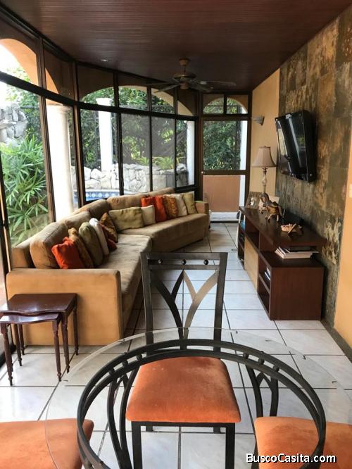 hay parqueo para dos carros, pequeño hall y amplia sala comedor de la que se sale a una cómoda salita de estar Desde esa sala se accede al patio con mesitas, sillas, y al fondo está el sauna.