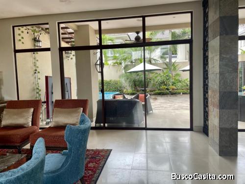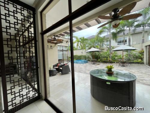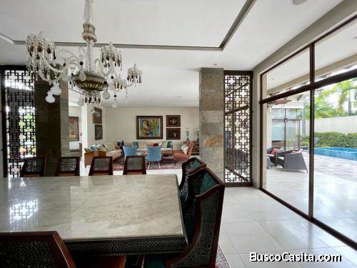 DISTRIBUCIÓN: SALA FAMILIAR, COCINA CON COMEDOR DE 12 PUESTOS, INCLUYE 3 ELECTRODOMESTICOS QUE SE ENCUENTRAN EMPOTRADOS, COMEDOR AMPLIO PARA 8 PERSONAS, 5 DORMITORIOS ; 2 DORMITORIOS SE ENCUENTRAN EN PLANTA BAJA, CADA DORMITORIO CUENTA CON BAÑO Y WALK IN CLOSET, JACUZZI, 2 CUARTOS DE SERVICIO, AMPLIA DESPENSA, AREA DE MÁQUINAS DE LIMPIEZA (ENTRAN HASTA 6 MÁQUINAS), BALCÓN, CUARTO DE ENTRETENIMIENTO EN LA ZONA EXTERIOR, ENTRADAS INDEPENDIENTES, GARAGE TECHADO PARA DOS VEHÍCULOS, SISTEMA INTEGRAL DE LUCES, SE INCLUYE LOS A/C, 2 BODEGAS, ACABADOS DE PRIMERA.