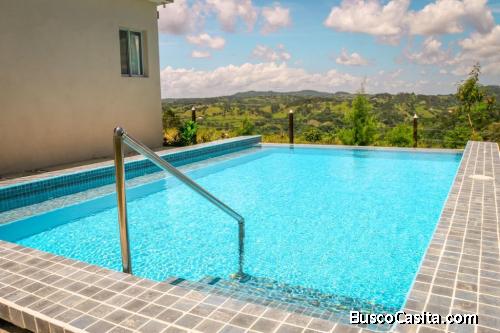 Exclusivo complejo de 5 villas amuebladas en Jarabacoa, a 13 min del centro en Estancita, El Balcón. Ideal para alquileres vacacionales o uso personal, con vistas panorámicas, piscina compartida, gazebo, planta eléctrica e inversor. Cada villa tiene cocina equipada, balcón con BBQ y, algunas, jacuzzi.
