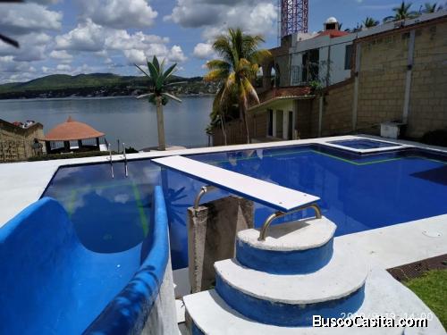 Con playa y acceso al lago, terraza asoleadero junto al lago, muelle, lanchero grande (cabe lancha de 32 pies, 2 runlover o moto sky) planta potabilizadora de agua del lago. Jardín, palapa, 2 asadores, aqua bar, alberca, amplía área seca de asoleadero, palmera regadera en zona de alberca 2 ½ baños, trampolín, poza de clavados, tobogán, jacuzzi y temazcal, 2 calderas, cisterna y factibilidad de conectarse a la red de agua potable del Municipio.
