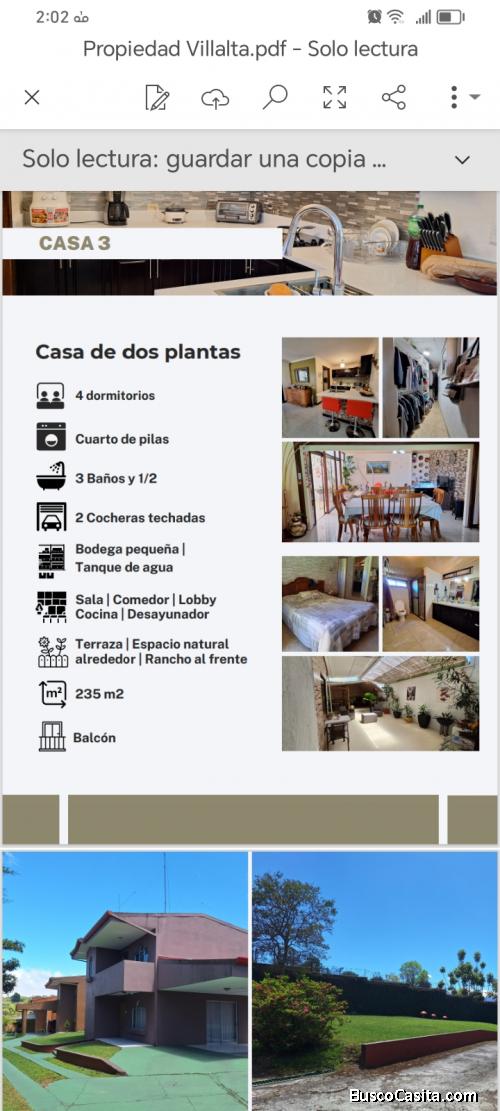 Se esta vendiendo esta belleza de propiedad con 3 elegantes casas, ubicada en San Ramon de Tres ríos, Cartago. De tamaño la propiedad cuenta con 700 m2 (setecientos metros cuadrados), las tres casas están hechas en block y con los mas finos acabados, supervisadas por arquitectos e ingenieros de los mas reconocidos en el país. Dos de las casas cuentan con una construcción de 150 metros cada una, mientras que la otra tiene una construcción de 300 metros. Las dos primeras cuentan cada una con 2 bellísimas habitaciones, mientras que la otra cuenta con 3. Adicionalmente todas cuentan con 2 baños completos, sala, comedor, cocina, cuarto de pilas, patio, cochera y hermoso frente. La propiedad en si cuenta con vistas espectaculares hacia la Campiña y otras zonas de gran atractivo y por la posición geográfica en que se encuentra la convierten en una verdadera opción para los conocedores. Todos sus documentos como plano, escritura y otros están al día.