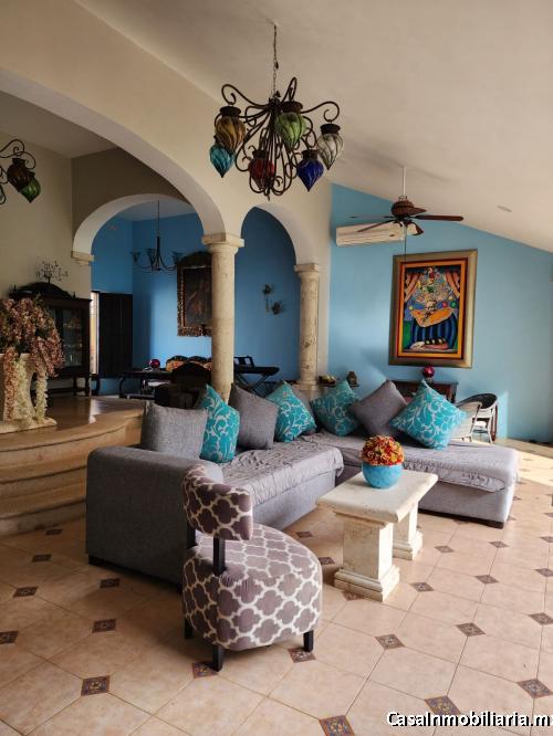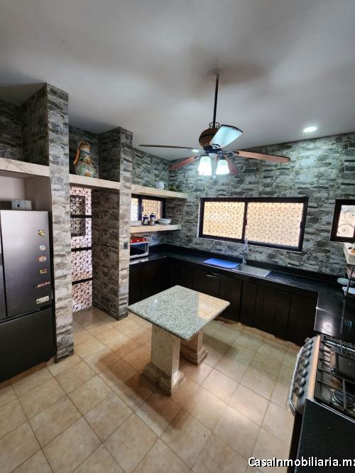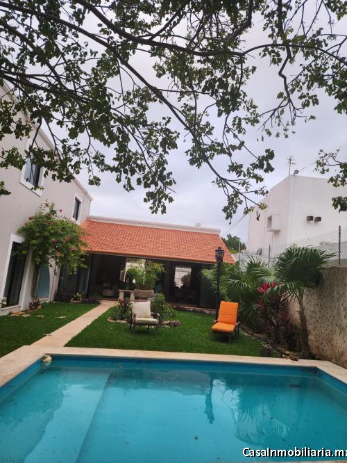 Hermosa casa tipo hacienda estilo Izamal en Venta, bien distribuida. Ubicación privilegiada a unas cuadras de av. García Lavín y av. Cámara de comercio, en C. 43 #316, San Ramón Nte, 97117 Mérida, Yuc. Num. Ext. 316 Colonia San Ramon Norte C.P. 97117, Yucatán, cuenta con 5 baños, 1 medio baño, 380 metros cuadrados, 5 amplias recámaras, y 2 pisos, dos salas y comedor. Cuenta con diferentes amenidades como jardines con juegos infantiles (resbaladilla, tobogán, columpios y casita), alberca, regadera y terraza con barra y cocineta, a parte de una cocina completa, Tiene cuarto de servicio, con baño. Servicios que incluye: aire acondicionado, 2 estacionamiento en cochera privada con portón automático y mucho espacio de estacionamiento sobre la calle. Presurizador de agua, 2 pozos y páneles solares.