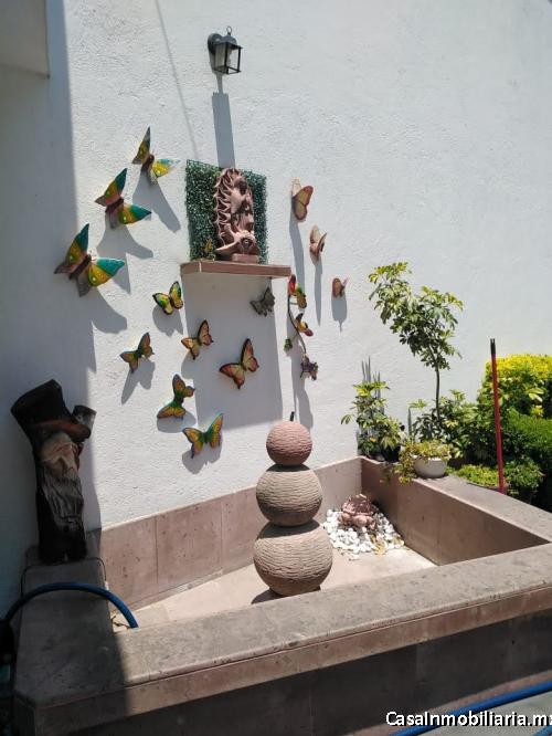 Planta baja: Sala, comedor, cocina integral, medio baño, bodega, cuarto de lavado, pequeño patio, jardín con fuente decorativa y estacionamiento para 3 autos.