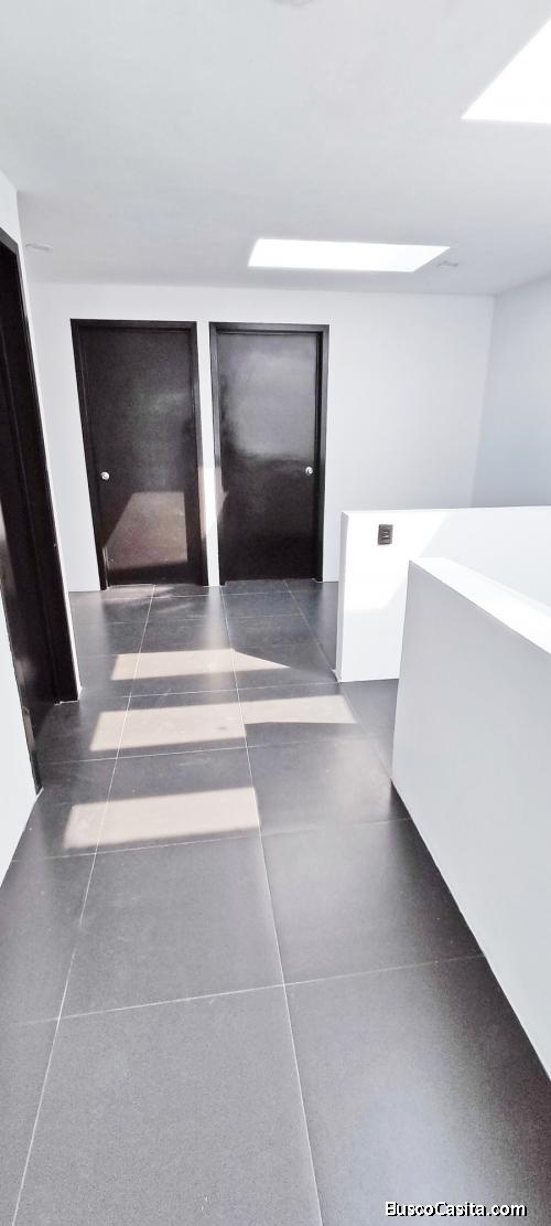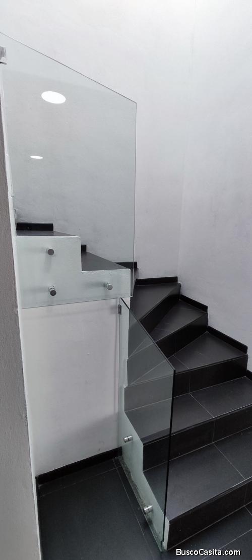 Tiene acabados modernos, ventanería de aluminio, cristales tintex, pisos Interceramic, barandal de cristal templado.