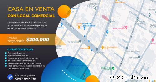 Casa ubicada en el sector de San Antonio de Pichincha. Cuenta con dos locales comerciales de 35 metros cuadrados cada uno, sobre la avenida principal del poblado, la más comercial del lugar. Cerca de restaurantes, farmacias, supermercados y bancos. El terreno posee 260 metros cuadrados para ser aprovechados en construcción de viviendas, centro comercial pequeño o cualquier negocio ya que su uso de suelo es múltiple.