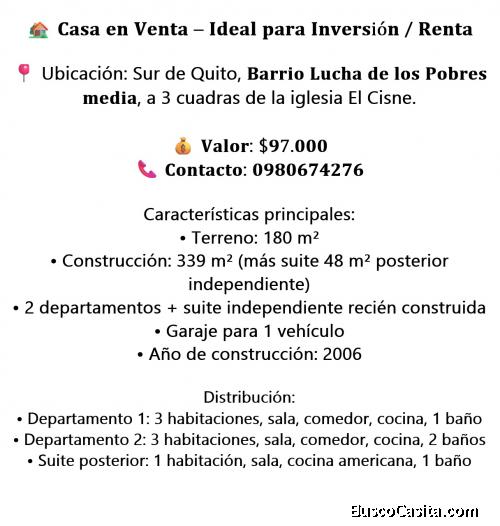 Casa en Venta – Ideal para Inversión o Renta en el Sur de Quito (Lucha de los Pobres)