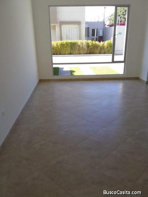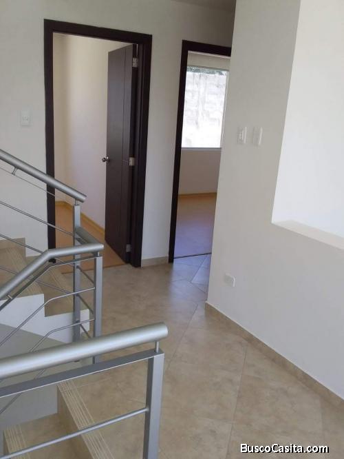 La Pampa frente al club de LDU conjunto cerrado, bonita casa de 120 metros en tres plantas, PB área social, sala, comedor, cocina, medio baño social, patio posterior con área para máquinas, Piso 2: dos dormitorios con baño completo compartido, sala de estar, closet para ropa blanca, Piso 3: dormitorio Master con vestidor y terraza. Un parqueo.