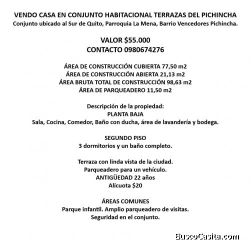 VENDO CASA EN CONJUNTO HABITACIONAL TERRAZAS DEL PICHINCHA, Sector La Mena, Sur de Quito.
