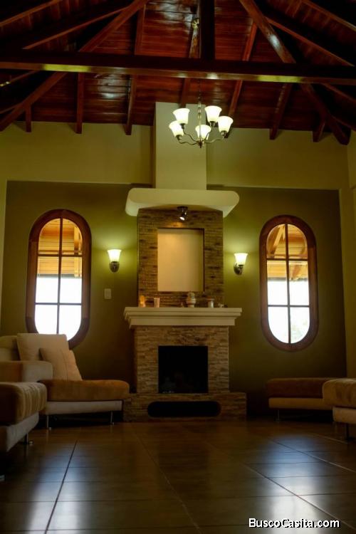 • Sala espaciosa con chimenea y gran ingreso de luz natural, tumbado de madera visto