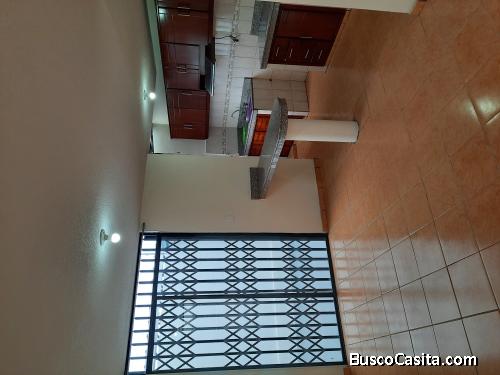 La casa en su primer piso: patio tapado de lavandería sala comedor cocina y bodega, segundo piso:dos dormitorios con un baño compartido