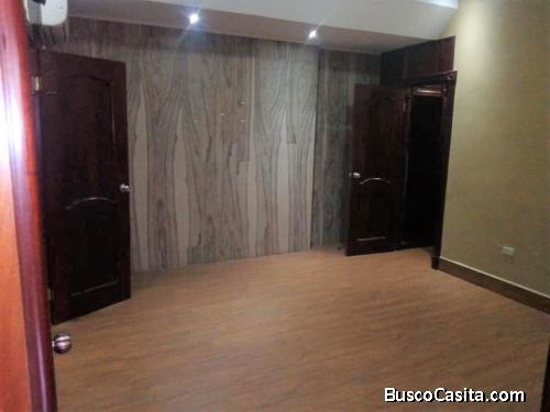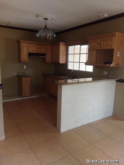 Casa de una planta, finos acabados, tres dormitorios, sala, comedor, cocina con muebles, dos garajes, para cuatro o cinco vehiculos, dos baños, cuarto de servidumbre, cercada de esquina.