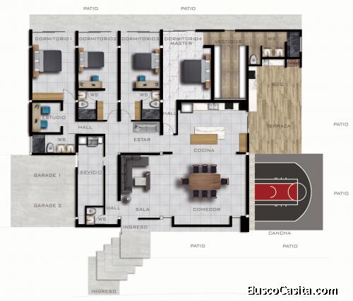 DISTRIBUCIÓN: Sala, baño social, comedor, Cocina americana, equipada con muebles altos y bajos, extractor de olores, plancha de inducción, isla central con mesón de cuarzo, conexión con área de terraza BBQ.