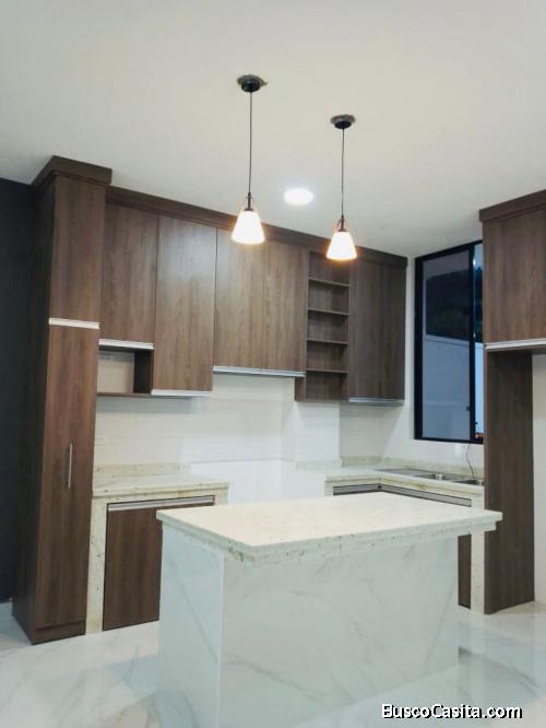 Cocina con muebles altos y bajos, mesón de granito