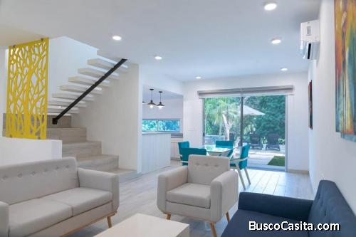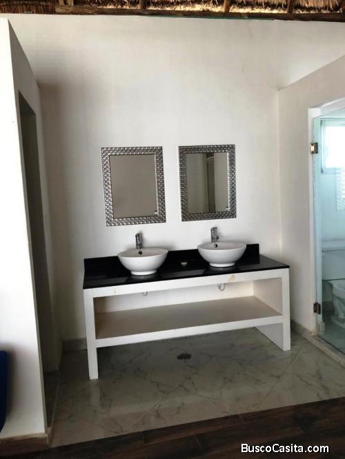 Exclusiva casa con espectacular vista al mar caribe y palapa. Cuenta con cochera techada para 1 vehículo, sala, comedor, cocina amueblada con barra, mesetas de granito, 2 recámaras, 2 y ½ baños, lavandería, terraza, jardín, balcón, cristal templado en la ducha de baño, acabados de primera, pisos de porcelanato.