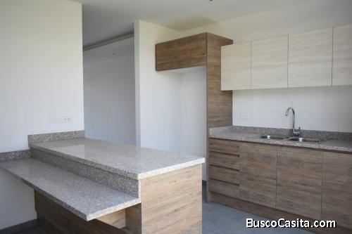 Cocina semi abierta con mesón desayunador, granito, muebles altos y bajos
