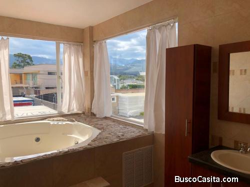Se vende casa independiente, en Mirasierra, Valle de Los Chillos, acogedora y cómoda con grandes espacios interiores y exteriores, cuenta con YACUZZI para 5 personas, NO adosada, en pequeño conjunto de 4 casas, con cerca y portón eléctrico, muy cerca al SUPERMAXI, San Luis Shopping, instituciones educativas y bancarias.