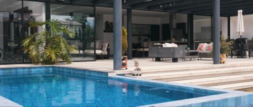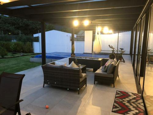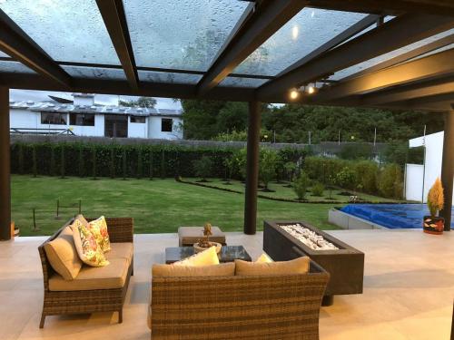 Área exterior cubierta: Pérgola con chimenea a gas (control remoto) con sillas, comedor, sala de estar y BBQ, un baño completo; Piscina temperada; Área de estacionamiento para 4 vehículos, Jardines, Área de máquinas y bodega