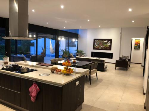 Planta baja: Área social integrada, sala con chimenea, comedor y cocina en un solo ambiente; cocina de Alta Gama equipada, fregadero, extractor tipo isla, lavavajillas, hornos (eléctrico y microondas), muebles altos y bajos, alacena, mesones y backsplash de cuarzo; medio baño social y closet para visitas