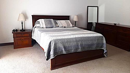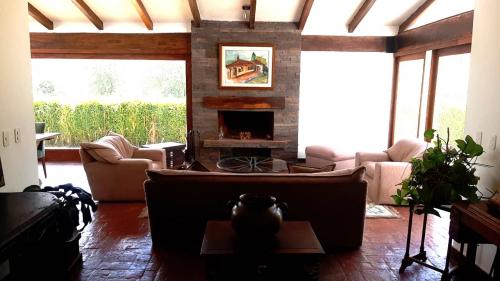 La casa es construida en 2 plantas, dispone de 3 amplios dormitorios con baño privado cada uno, 2 dormitorios en Planta baja y el Máster en Planta alta; sala principal con chimenea, sala de estar, 2 comedores, estudio u oficina, porche, BBQ, 5 estacionamientos, área de máquinas, pérgola, área de servicio, bodega, terraza, cisterna de 8m3, amplias áreas verdes, jardines y frutales