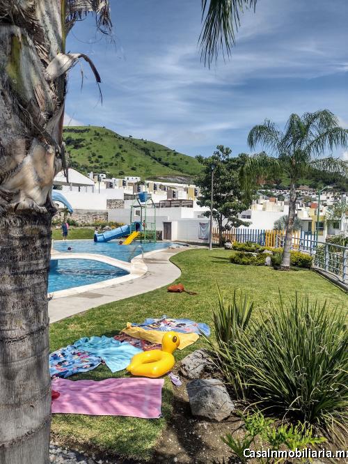 Residencial Bello Horizonte, áreas comunes con alberca, jardines y palapa, con exclusivo parque acuático.